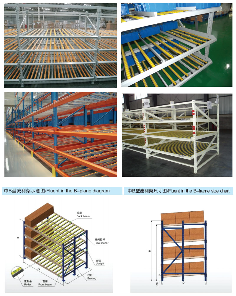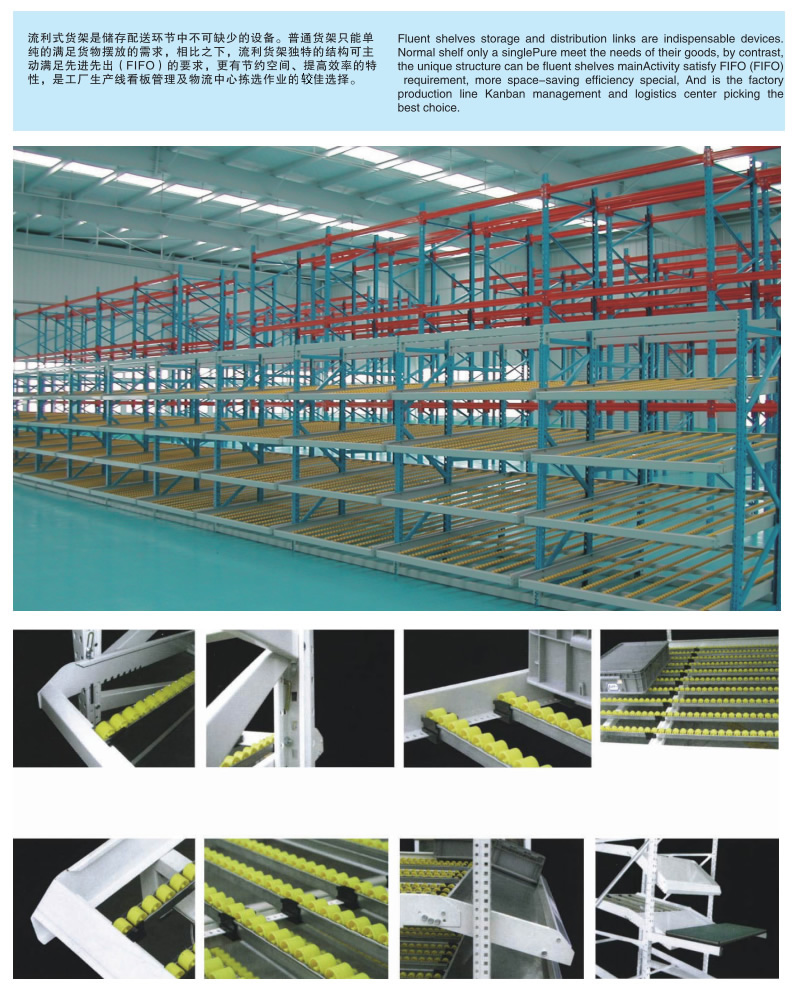 流利式货架广泛应用于制造业,商业,配送中心,装配车间以及出货频率较高的仓库流利式货架:采用辊轮铝合金,钣金等流利条,利用台架自重实现先进先出,存储方便,适用于装配线两侧配送中心等场所。